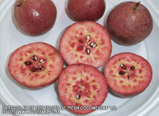 It is one of the so-called “ancient fruits,” which are very old and only found in a few small areas. The Cocomerina variant of the European pear is restricted to the Apennine area of Romagna and Tuscany. The early-ripening cultivar is harvested in August, while the late-ripening one is collected in October.
