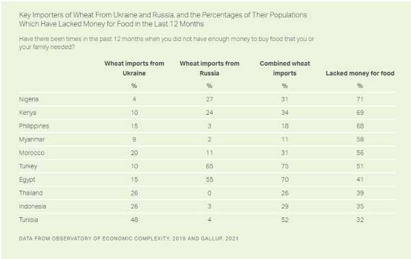 According to new Gallup data, the most vulnerable nations, of course, are those most reliant on wheat produced by Russia and Ukraine with large segments of their populations already struggling to afford food before the war broke out. In addition, several countries on the list including Egypt, Kenya and Turkey are also dealing with internal political instability and conflict, situations that only worsen when people go hungry.