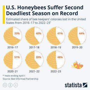 The Bee Informed Partnership recently published their annual Colony Loss and Management Survey, and for the seventh year in a row, the results were grim. According to the survey, the last pollination season was the second most deadly on record for U.S. honeybees. From April 1, 2022 to April 1, 2023, US beekeepers lost an estimated 48.2% of their honey bee colonies. The report includes surveys from small and large-sized operations involving 3,006 US beekeepers who collectively manage 314,360 colonies.